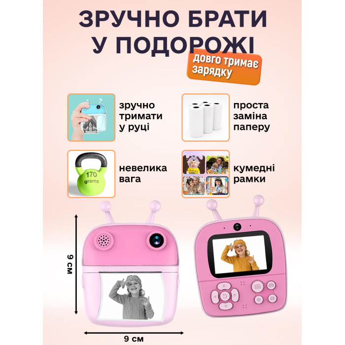 Дитячий фотоапарат миттєвого друку 5в1 + відео камера + принтер швидкий друк фото + mp3 плеєр + вбудовані ігри (Рожевий) 2 рулони фотопапіру в комплекті