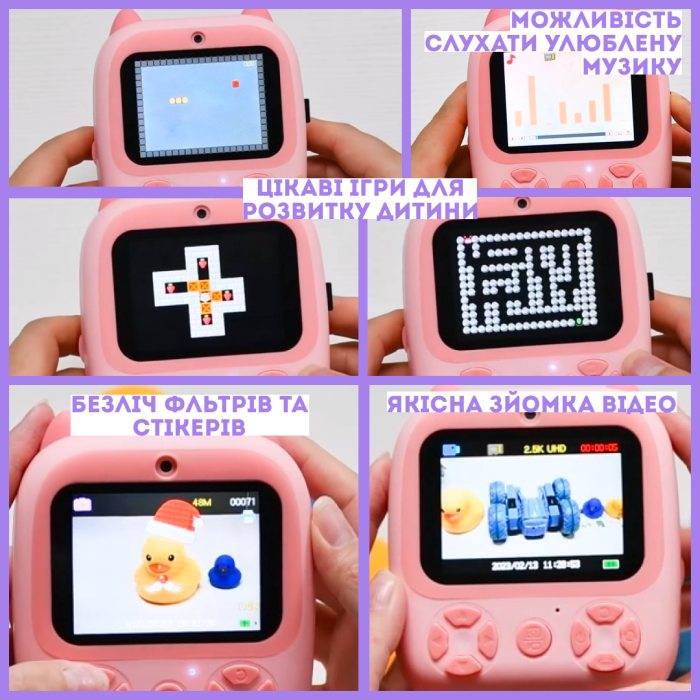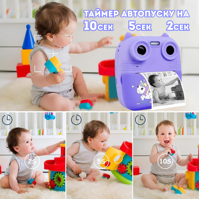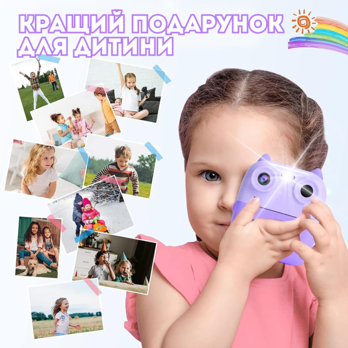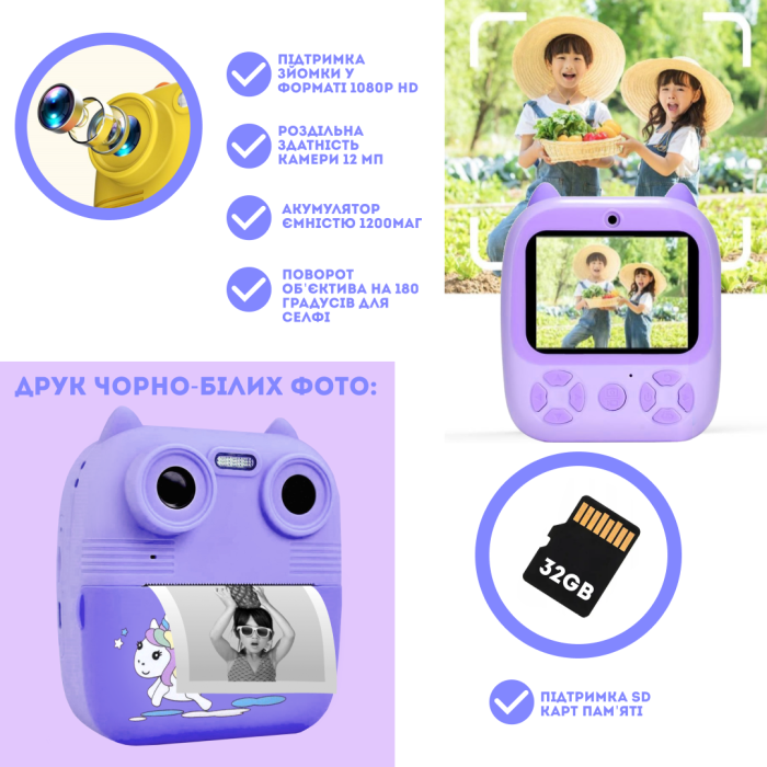 Дитячий фотоапарат миттєвого друку кольоровий цифровий D8S Premium 1080P HD 12Мп компактний легкий фотоапарат полароід камера з миттєвим друком для дітей термодрук (Фіолетовий єдиноріг)