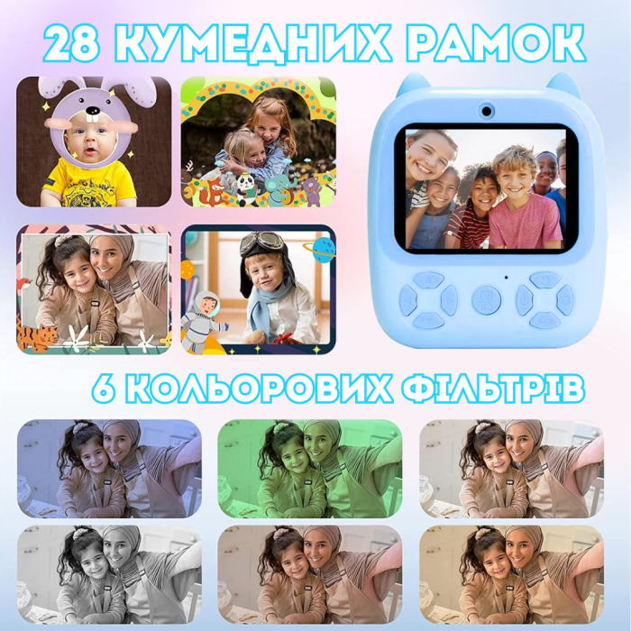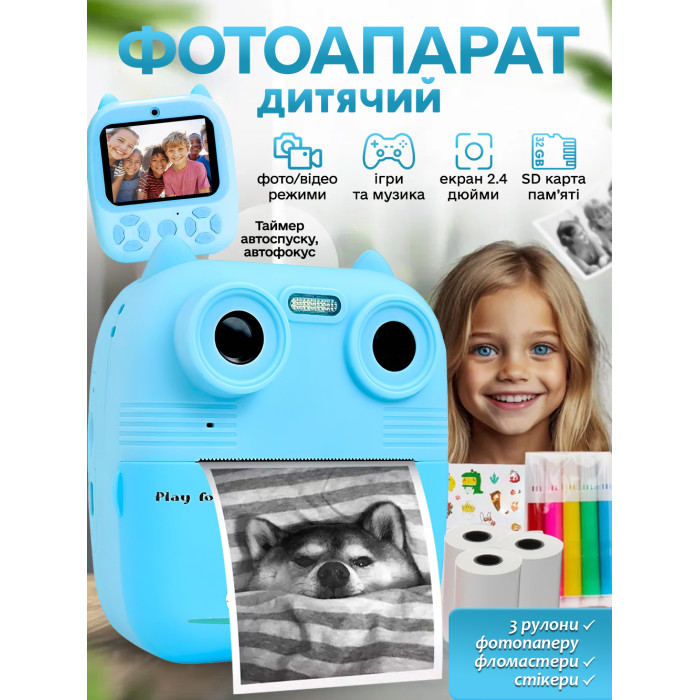 Дитячий фотоапарат миттєвого друку кольоровий цифровий D8S Premium 1080P HD 12Мп компактний легкий фотоапарат полароід камера з миттєвим друком для дітей термодрук (Голубий Ведмедик)