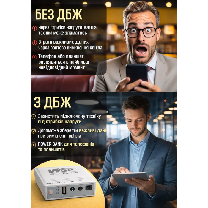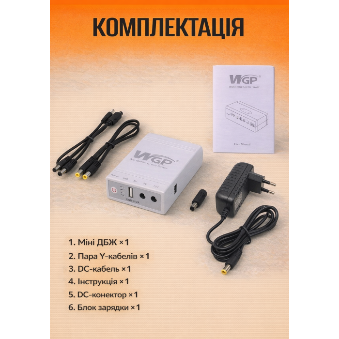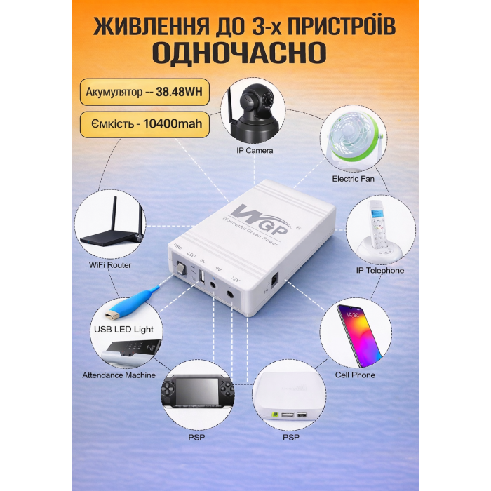 Міні УБП Моделі WGP 103A-5912 10400mah ідеально підходить для використання в домашніх та офісних умовах, забезпечуючи стабільне живлення для Wi-Fi роутерів, модемів, бездротових телефонів та систем відеоспостереження. Незамінний для тих, хто хоче захистити свою техніку від перебоїв у електропостачанні.